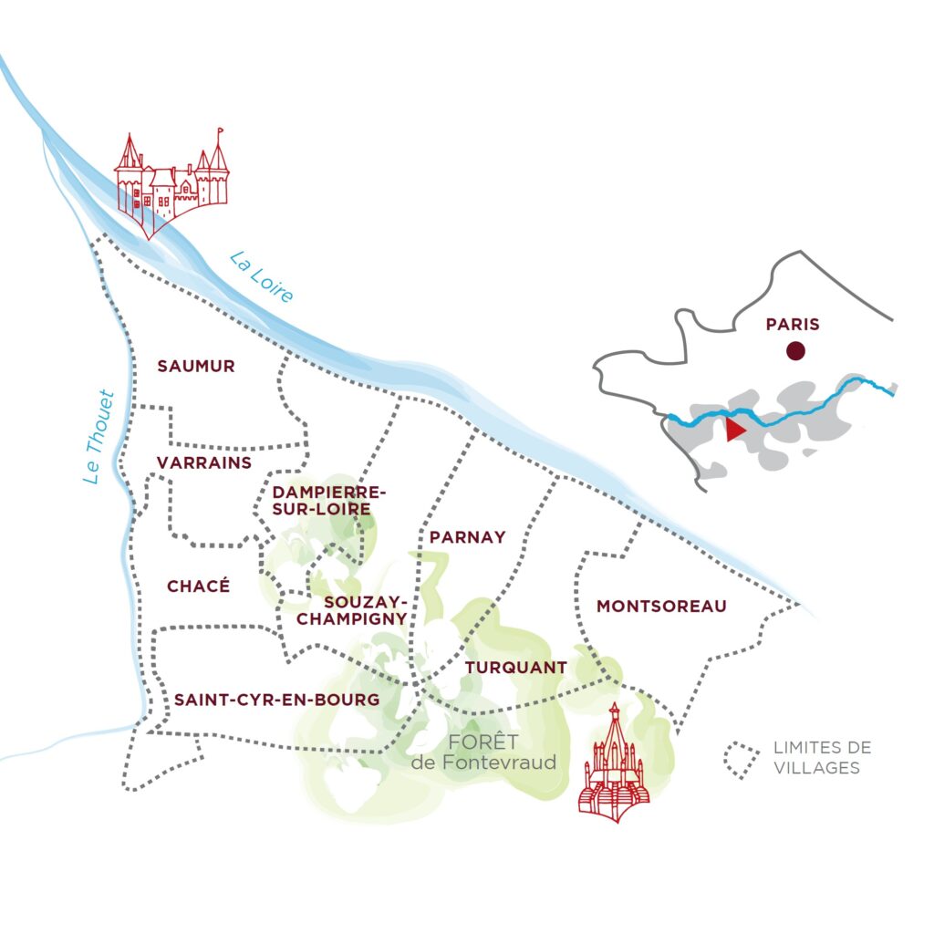 Cette carte dévoile l’aire d’appellation Saumur-Champigny, ses villages et ses paysages viticoles. Elle offre un repère essentiel pour comprendre le territoire et préparer une découverte des vignobles du Saumur-Champigny.