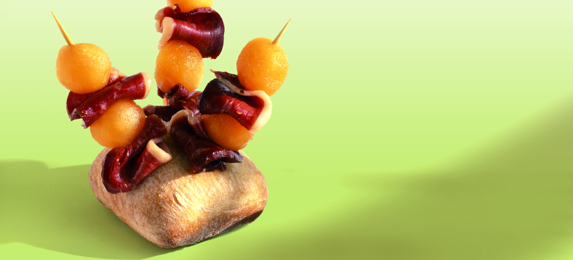 Dresser les brochettes sur de petits piques en bois, alterner le magret séché et le magret fumé.