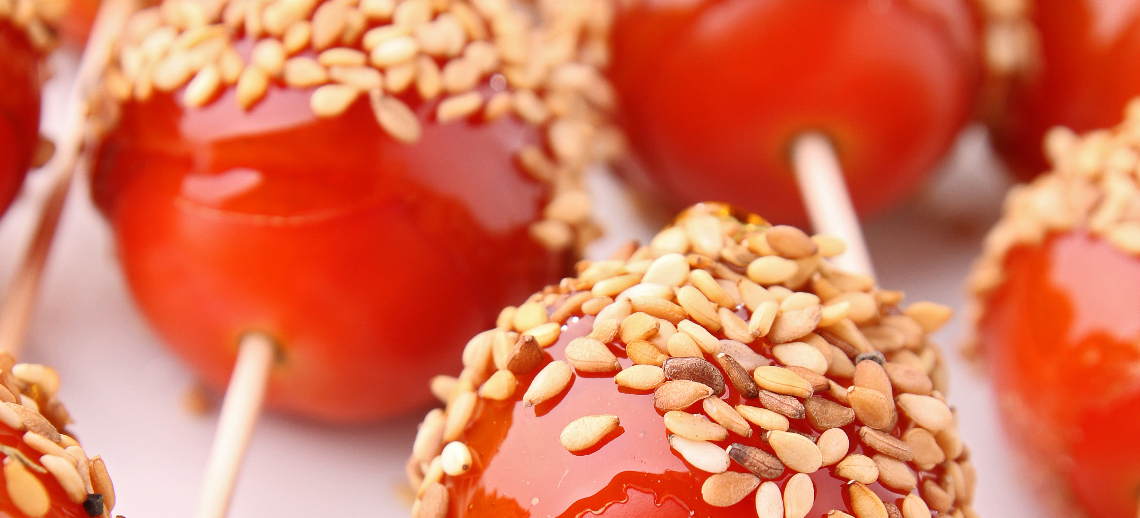 Plonger les tomates dans le caramel puis dans les graines de sésame ou de pavot.