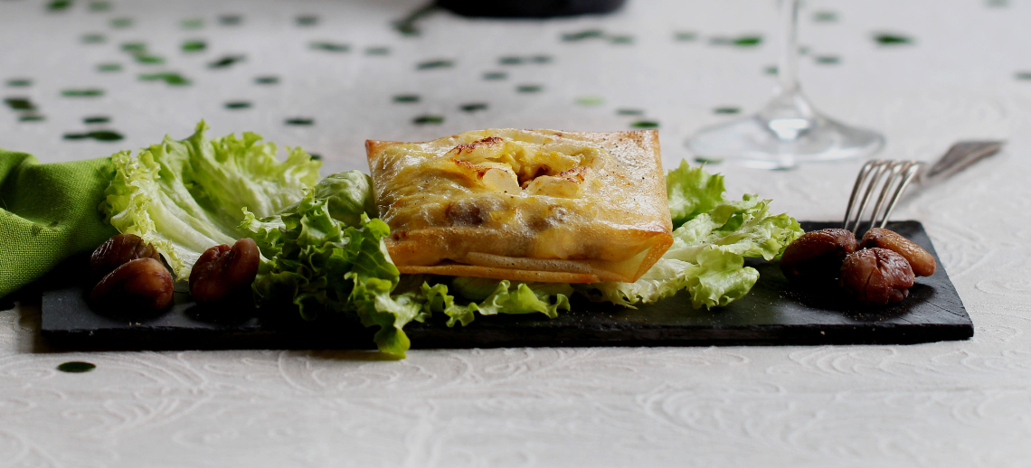 Servez les bricks chauds, accompagnés avec de la salade verte et des marrons concassés.